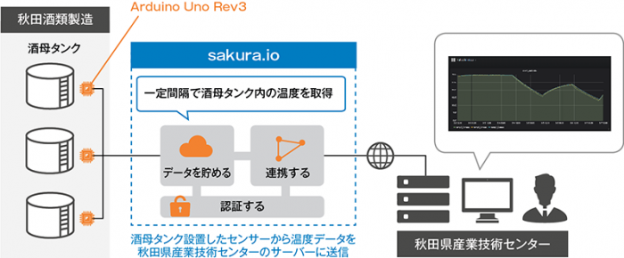 全国的に名高い秋田の銘酒「高清水」の蔵元である秋田酒類製造株式会社は、IoT技術を活用して日本酒のもろみ発酵の温度管理を行う仕組みを秋田県産業技術センターと共同開発し、2018年から2019年にかけて実証実験を行いました。酵母を純粋培養する工程である「酒母」のタンクに設置したセンサーから取得したデータの収集・送信には、さくらインターネットが提供するIoTプラットフォームサービス「sakura.io」が採用されています。