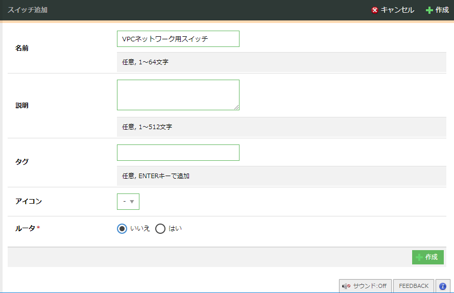 ※今回の例で作成するのはルータ機能を持つ「ルータ+スイッチ」ではなく「スイッチ」となるため、新規作成画面内の「ルータ」のラジオボタンでは「いいえ」が選択されていることを確認してください