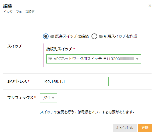 まず初めに先の項目で作成したVPCネットワーク用スイッチに接続します。VPCルータのインターフェース設定のページを参考に、インターフェース名「プライベート1」にスイッチを接続する設定を行います。この際先に挙げた想定ネットワークの通り、IPアドレスを192.168.1.1、プリフィックスに/24を選択します。