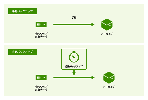 - 自動バックアップ、アーカイブの手動操作によりさくらのクラウド内のアーカイブにディスクの完全バックアップが実行できます。
