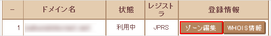 ドメイン名一覧から、ゾーン情報を変更したいドメインの『 ゾーン編集 』をクリックします。
