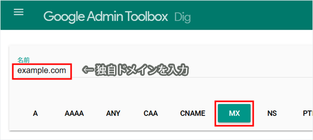 外部ã®Googleã®ã‚µã‚¤ãƒˆ(Google Admin Toolbox Dig)を利用ã—ã¦ã€