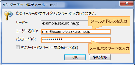 | ユーザー名 | 設定する(利用する)メールアドレスを入力します。 例)mail@example.sakura.ne.jp |