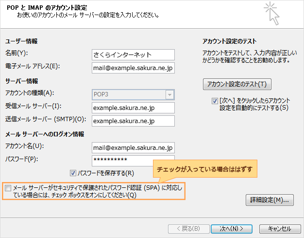 セキュリティで保護されたパスワード認証(SPA)に関する設定項目が有効になっている可能性があります。