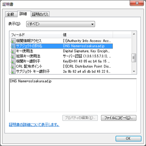 証明書の詳細タブを表示後、フィールド「サブジェクトの別名]や