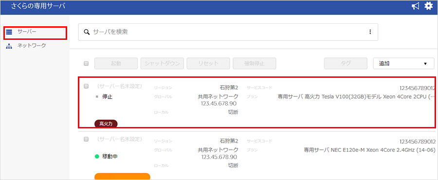 1サーバー一覧画面にて対象サーバーを選択し、サーバー詳細画面へ表示を切り替えます。
