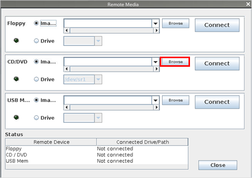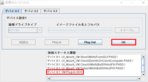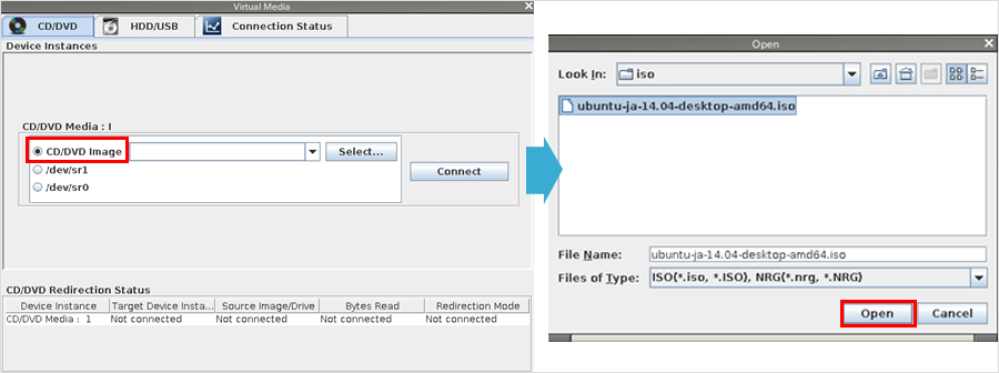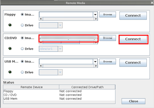 クリックで対象ファイルを選択し「Connect」をクリックいただく事によってISOイメージがマウントされます。