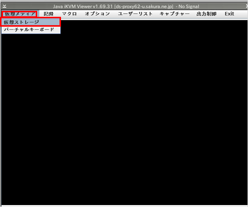 3コンソールメニューの「仮想メディア」から『仮想ストレージ』をクリックします。