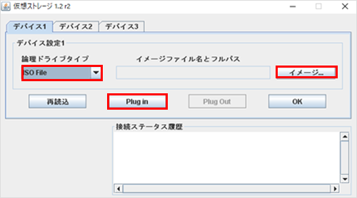 「イメージ」をクリックし、ISOイメージを選択した後、『Plug in』をクリックします。
