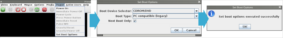 - モデルによっては、コンソールメニューの「Power(電源)」から「Set Boot Options(起動オプションの設定)」にて「CDROM/DVD」を事前に選択する必要があるものがあります。