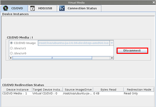 ISOイメージがマウントされると、「Connect」が「Disconnect」の表示に切り替わります。