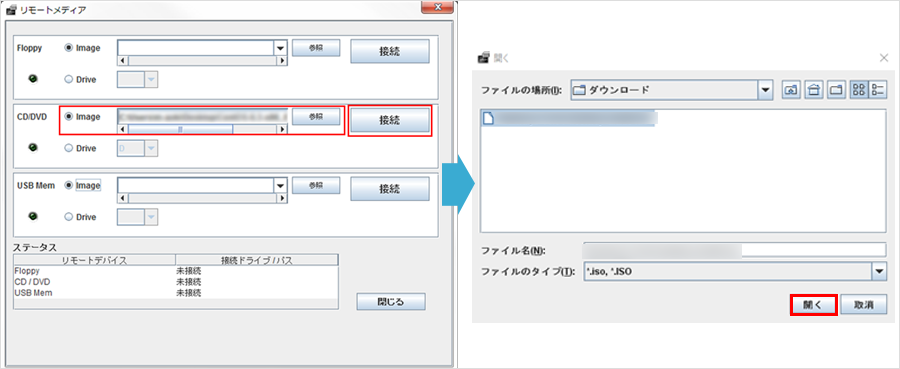 「参照」をクリックし、ISOイメージを選択した後、『接続』をクリックします。