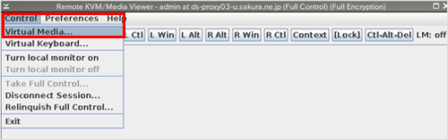 3リモートコンソール画面上部「 control 」を選択し、『 Virtual Media… 』をクリックします。
