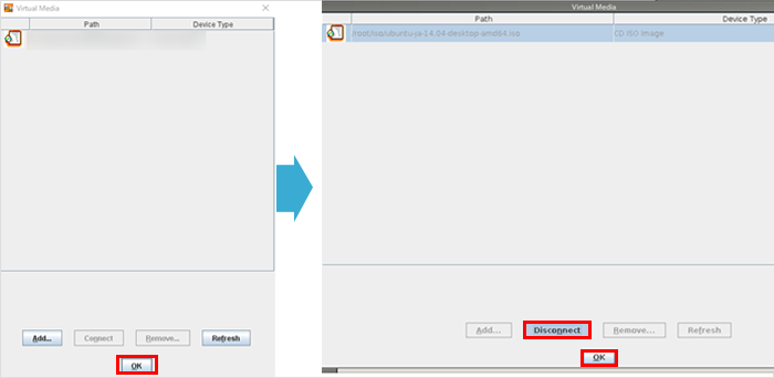 ISOイメージのマウントを確認いただいた後、OKをクリックし「 Virtual Media 」の画面を終了します。※マウント後、「 Virtual Media 」の画面に以下の表示がされますが