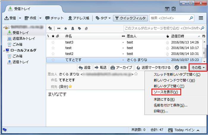 2対象のメールを一覧から選び、『 その他 』‐『 ソースを表示(V) 』をクリックします。