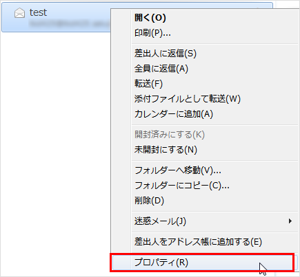 2対象のメールを一覧から選び、右クリックし『 プロパティ(R) 』をクリックします。