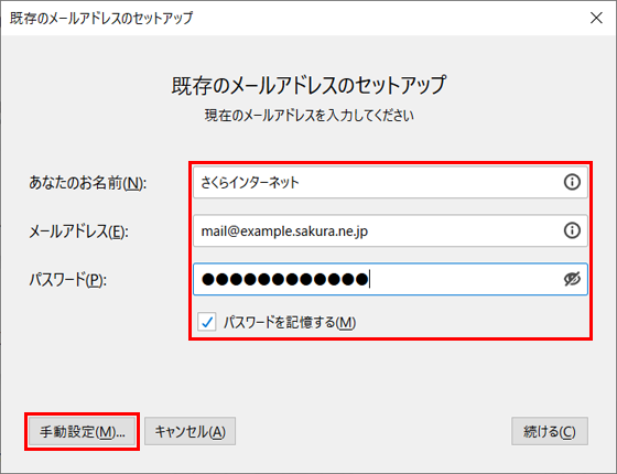 3既定のメールアドレスのセットアップ画面が開きます。以下の項目を入力し、『 手動設定 』ボタンをクリックします。