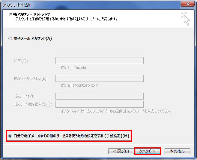 2自動アカウント セットアップ 画面で『 自分で電子メールやその他のサービスを使うための設定をする(手動設定)(M) 』にチェックをいれ、 『 次へ(N) 』をクリックします。