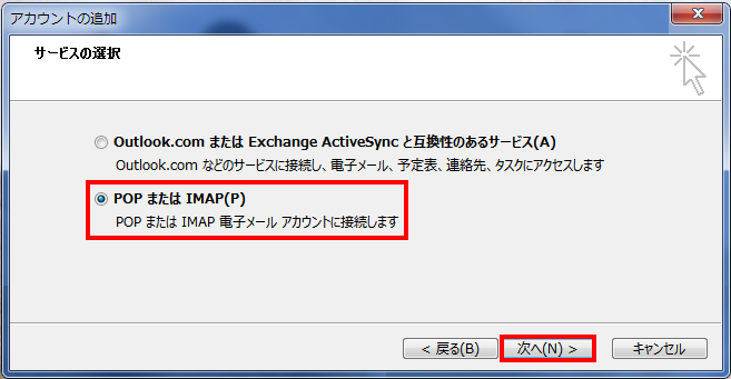 3サービスの選択 画面で『 POP または IMAP(P) 』にチェックを入れ、『 次へ(N) 』をクリックします。