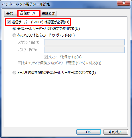 4『 送信サーバー 』タブを選択し、SMTP認証を有効にするため『 送信サーバー(SMTP)は認証が必要(O) 』にチェックします。