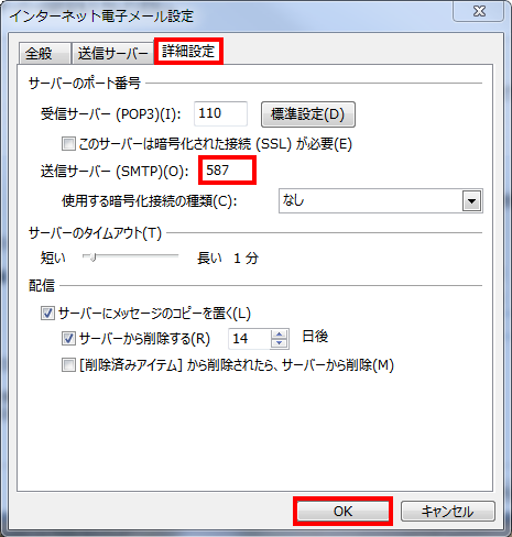 5『 詳細設定 』タブを選択し、『 送信サーバー(SMTP)(O): 』に『 587 』と入力し、『 OK 』をクリックします。