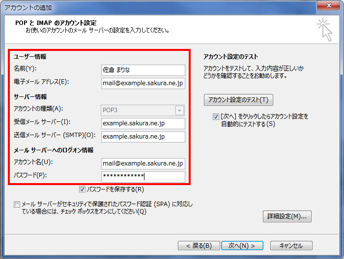 ※ IMAPで設定される場合は、POP3をIMAPに置き換えて設定してください。