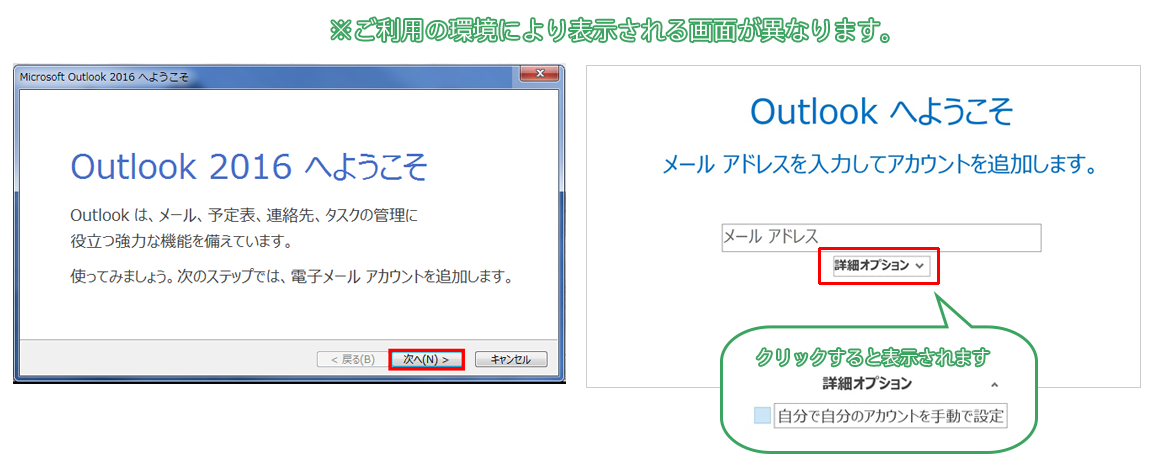 - 「Outlook 2016へようこそ」画面が表示された場合はこちら