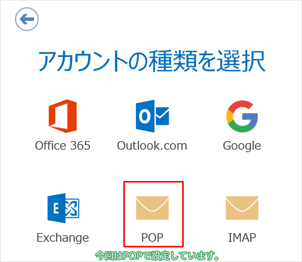 3「アカウントの種類を選択」が表示されますので、「POP」をクリックします。