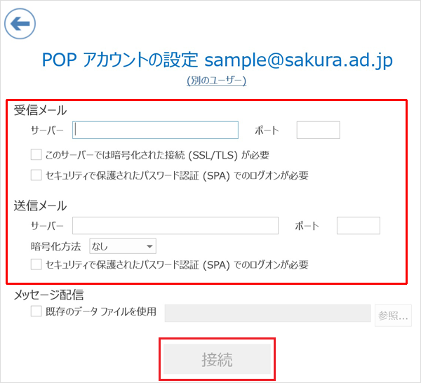 以下の項目を設定し、「接続(または)次へ」をクリックします。
