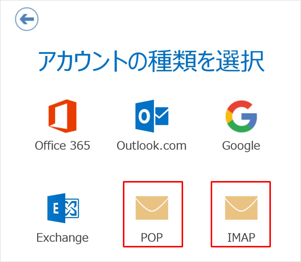3「アカウントの種類を選択」が表示されますので、「POP」または「IMAP」をクリックします。