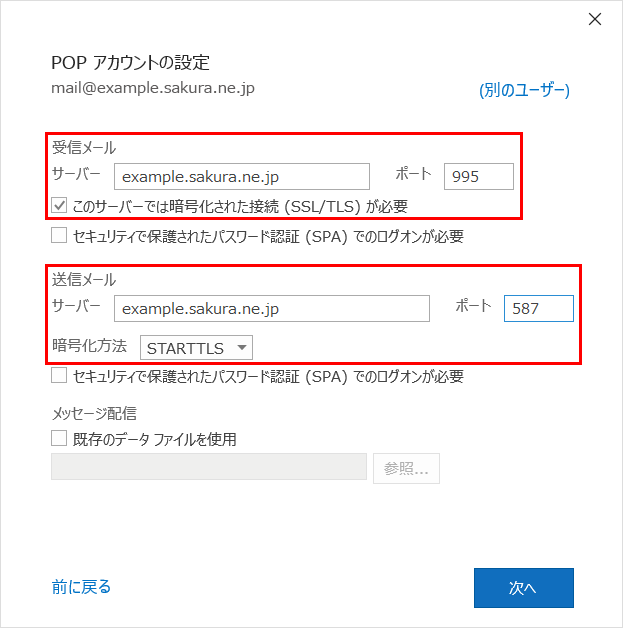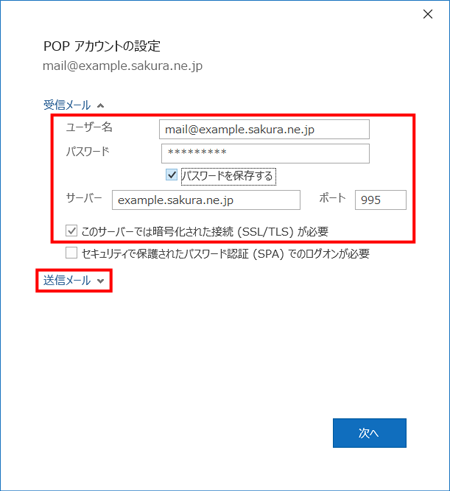 チェックあり 「受信メール サーバーと同じ設定を利用する」を選択 |