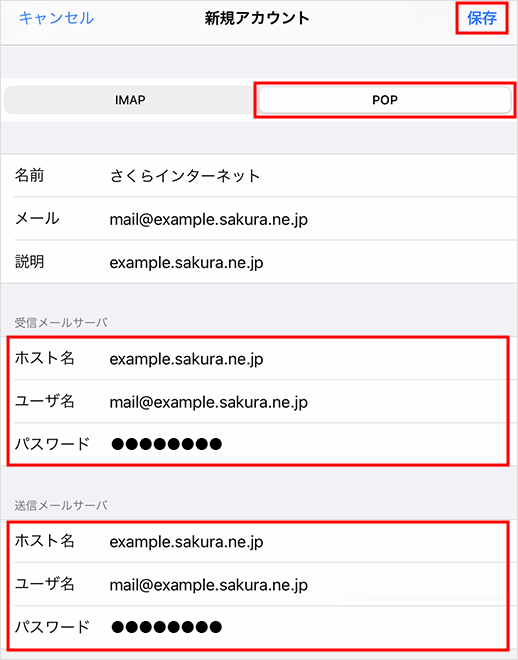 9「受信設定」枠内全ての項目を入力し、問題がなければ、左上の『 設定したメールサーバー名 』をタップします
