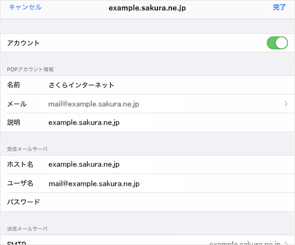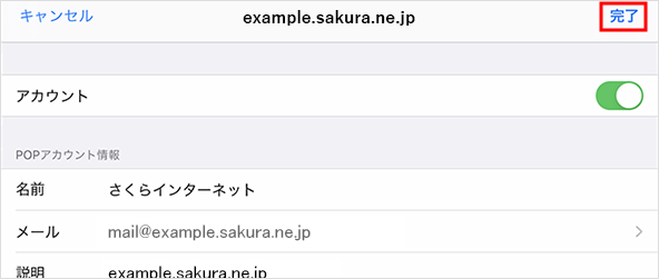 8メールアカウントの画面に戻りますので、画面上部の『 完了 』をタップします。