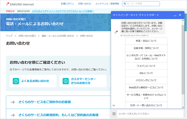 2021年12月15日より、カスタマーセンターのお問い合わせ方法のひとつである「チャットサポート」にて、チャットボットを使用した自動回答サービスの提供を開始しました。