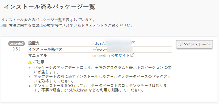 3インストール済みパッケージ一覧にインストールしたconcrete5が表示されます。