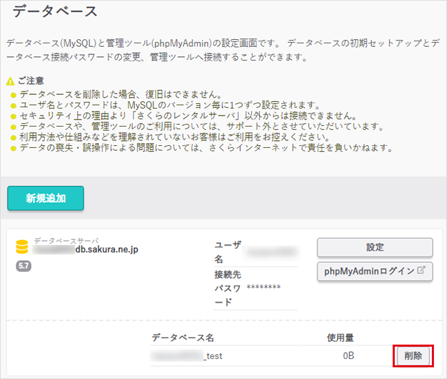 2該当データベース名の右側に表示している『削除』をクリックします。