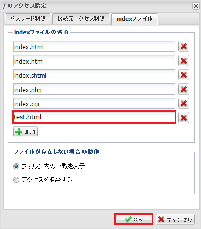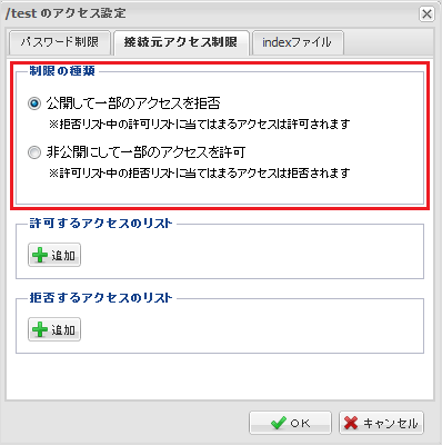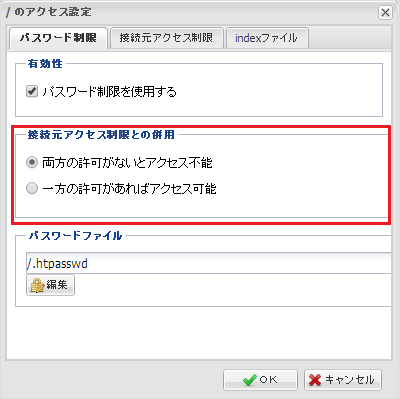 | 一方の許可があればアクセス可 | 『 パスワード制限 』『 接続元アクセス制限 』のいずれか一方のタブに設定された条件を満たせば、アクセスが許可されるようになります。 |