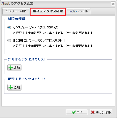 接続ホストやIPアドレスで制限をかけます。設定を行った下層フォルダに適用されます。
