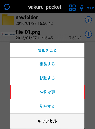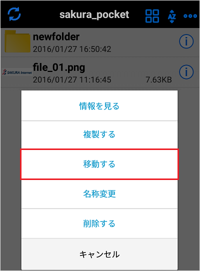 1対象ファイル/フォルダ名の右側のメニューアイコンをタップします。