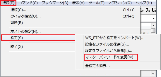 2『 接続(F) 』-『 設定(S) 』-『 マスターパスワードの変更(M)… 』をクリックします。