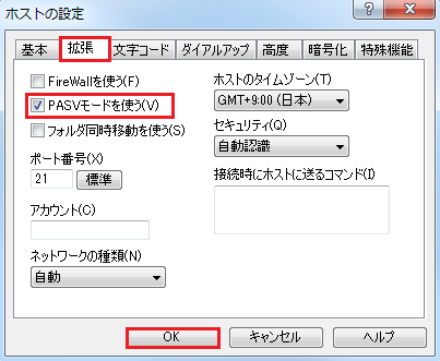ご利用のインターネット環境(ADSLやCATVなど)によって必要になる場合があります。 『 拡張 』タブを選択し、『 PASVモードを使う 』の項目より必要に応じて設定してください。