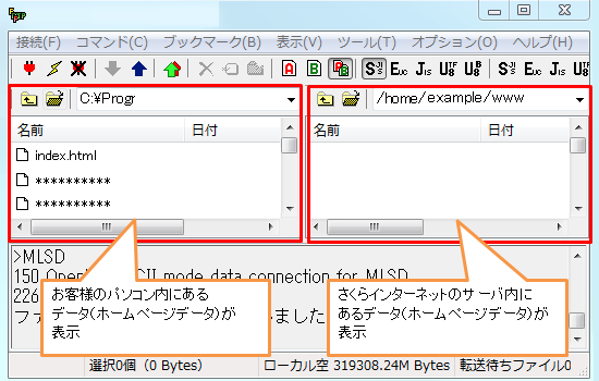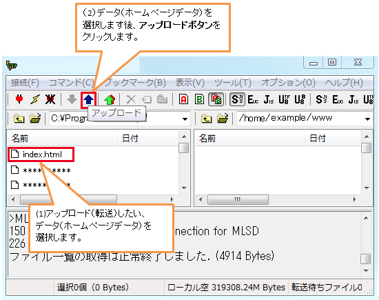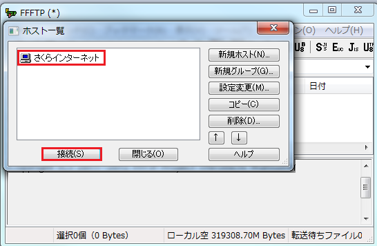 Webサイトの転送(接続テスト)実際にWebサイトデータを転送してみます。 1「 ホスト一覧 」の画面から、設定した『 ホストの設定名(T) 』を選択し、『 接続(S)』をクリックします。サーバーに接続できると「ファイル一覧の取得は正常に終了しました」とメッセージが表示されます。