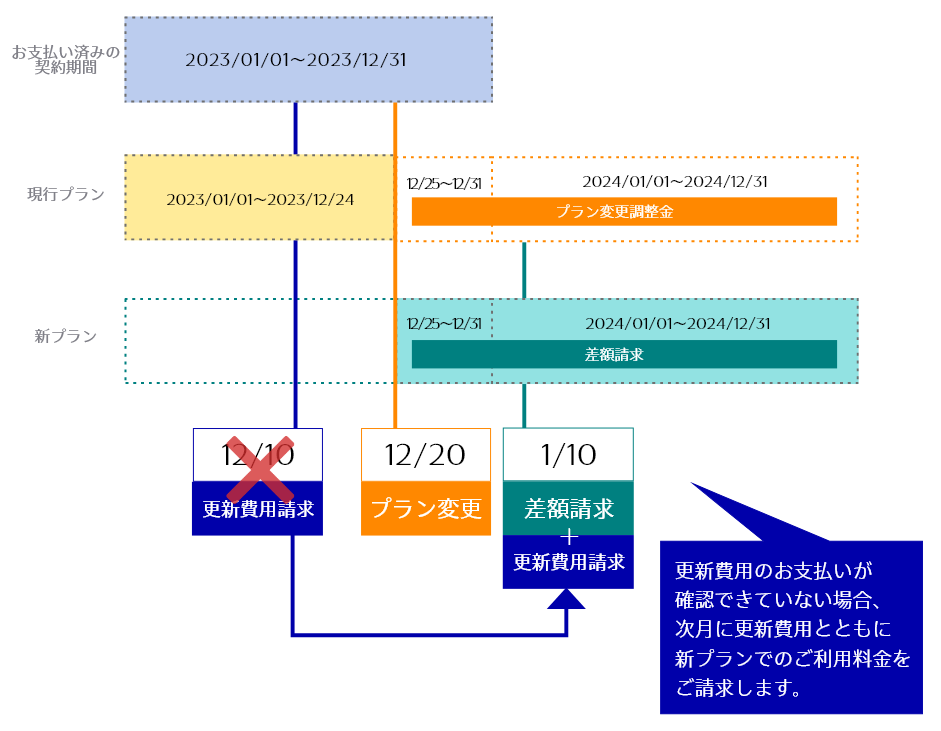 - 当月の更新費用のお支払いが完了していない場合、次月に新しいプランの料金でご請求いたします。