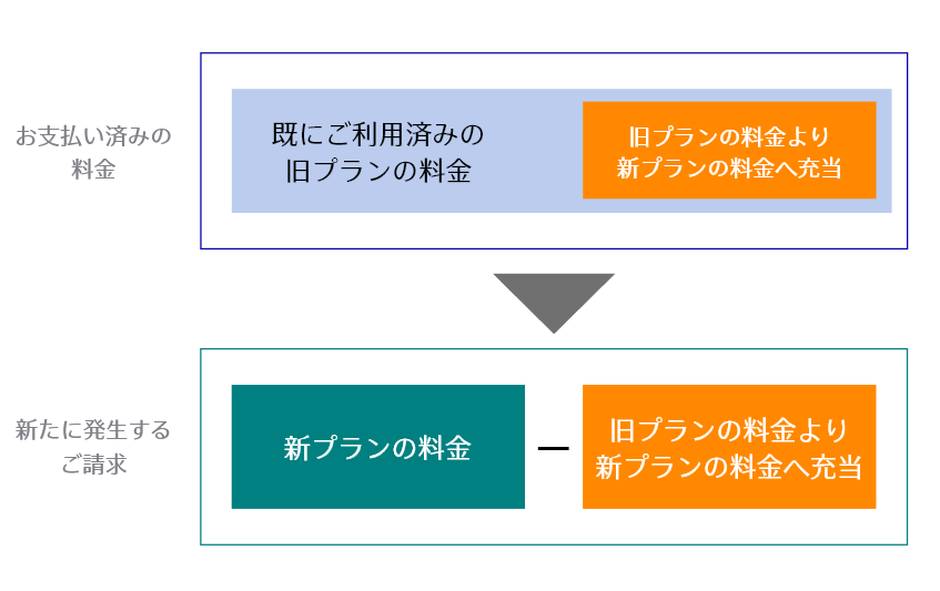 既にお支払い済みの更新費用より、現行プランご利用分の残りを新プランのご利用料金に充当してご請求いたします。