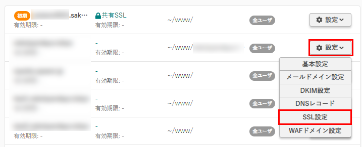 3設定したいドメイン名の右側にある『設定』をクリックし、『SSL設定』をクリックします。