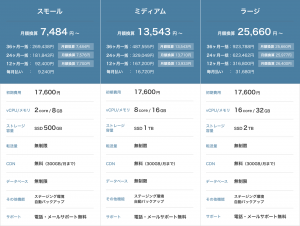 新プランは、サーバーの全ストレージをSSDとし、CPUのコア数、ストレージおよびメモリ容量の違いで「スモールプラン」「ミディアムプラン」「ラージプラン」3つのラインアップとなります。今までより低価格なプランもご用意し、選択肢の幅が広がって利用しやすくなりました。