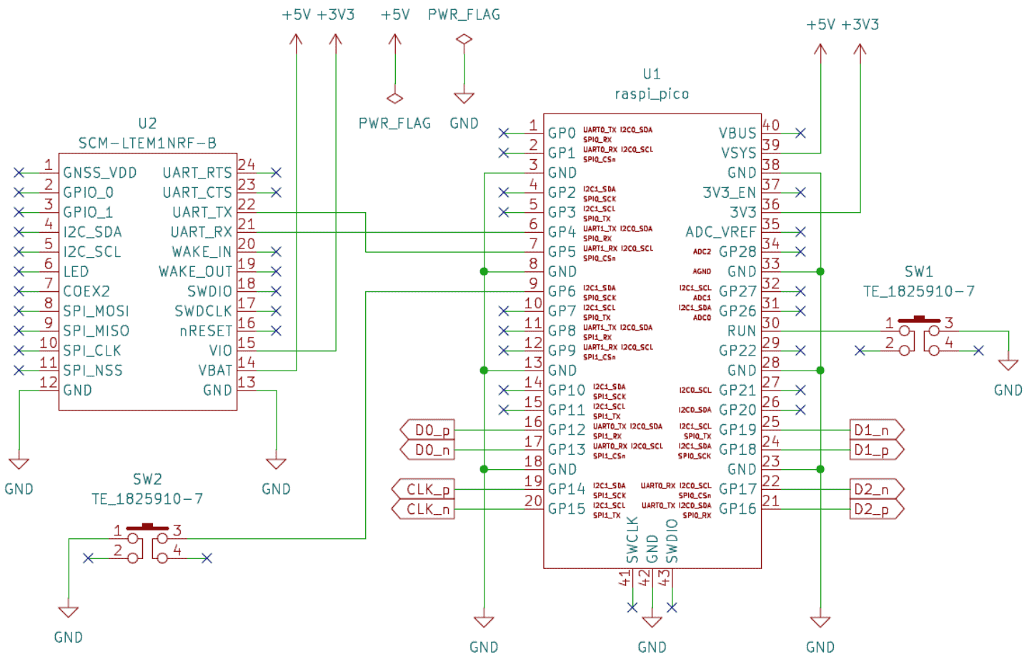 SCM-LTEM1NRF を搭載した電子看板制御ボードはRaspberry Pi PicoとSCM-LTEM1NRFを用いブレッドボード上に配線することによって構築されています。