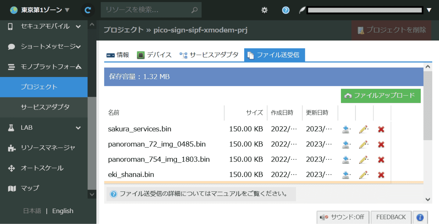 「さくらのクラウド」コントロールパネルにログインし、「モノプラットフォーム」-「プロジェクト」タブを開いたところです。電子看板制御ボードが用いるrgb565形式の画像ファイルが数個登録された状態が確認できます。