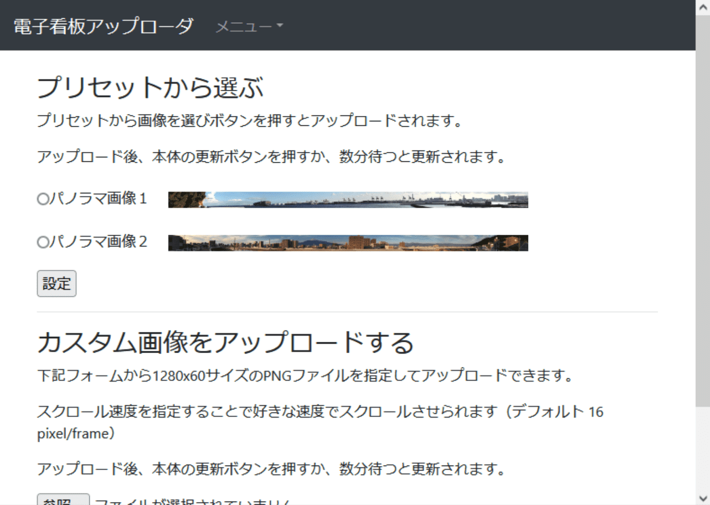 電子看板アップローダはdjango標準のパスワード認証機能(indexに対してlogin_requiredを設定)によって管理者以外の操作から保護します。indexページにフォームを配置し、カスタム画像のアップロードとシステムに登録されたプリセット画像の選択が行えるようにしています。フォーム投稿の際はその選択に応じて /custom もしくは /preset エンドポイントへのPOSTが行われます。/custom エンドポイントはアップロードされたpng画像をrgb565方式に変更した後custom.binの名前でモノプラットフォームプロジェクトにファイル登録、その後ファイル名としてcustom.binを書き込んだ文字列形式のメッセージ送信をモノプラットフォームに指示します。/preset エンドポイントはあらかじめWebシステムに記録されている画像を用いて内部的に/custom エンドポイントへのアクセスが行われた状態を想定して処理を行います。詳しくは電子看板アップローダソースコードをご覧ください。