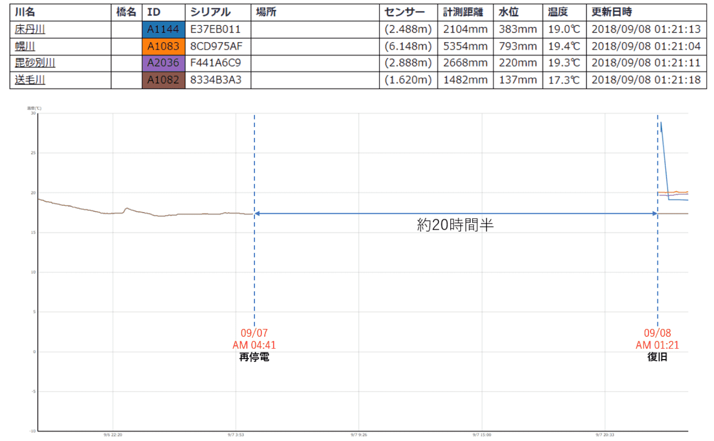 ついに9/8 AM1:21頃、復電の合図かの如く浜益に設置している水位センサから同時刻で一斉にデータが届きます。商用電源から給電しているゲートウェイからデータが中継されており、当該地域において復電したことが伺えます。
